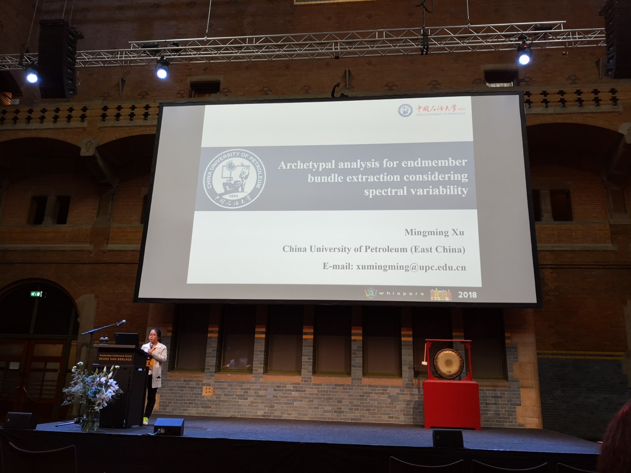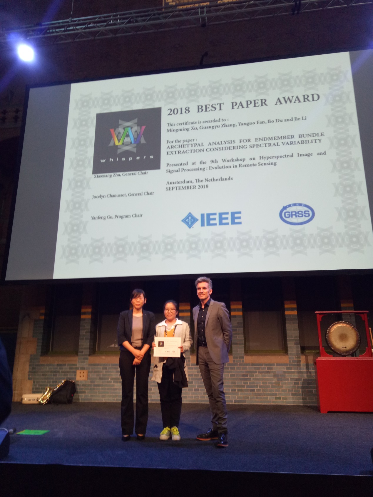 在本次会议上,冰球突破豪华版官方网站测绘系许明明博士做了题为:“Archetypal analysis for endmember bundle extraction considering spectral variability”的口头报告,第一次提出“支撑端元”的概念,为解决混合像元分解中光谱变化问题提供了新的思路,受到与会者的广泛关注与讨论,被大会评为最具突出贡献的论文,被授予“2018 Best Paper Award”。