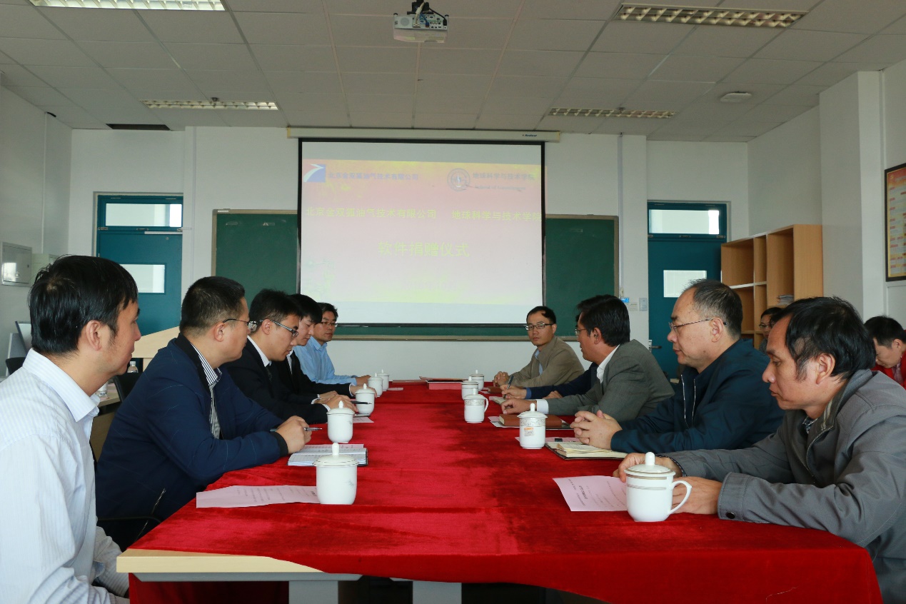 【本站讯】10月11日上午,冰球突破豪华版官方网站地球科学与技术学院“北京金双狐油气技术有限公司双狐软件捐赠仪式”在工科楼C座367会议室举行。北京金双狐油气技术有限公司总经理周国强、学校合作发展处副处长张炜、学院党委书记张卫东、副院长裴仰文,资源系教师代表出席捐赠仪式。