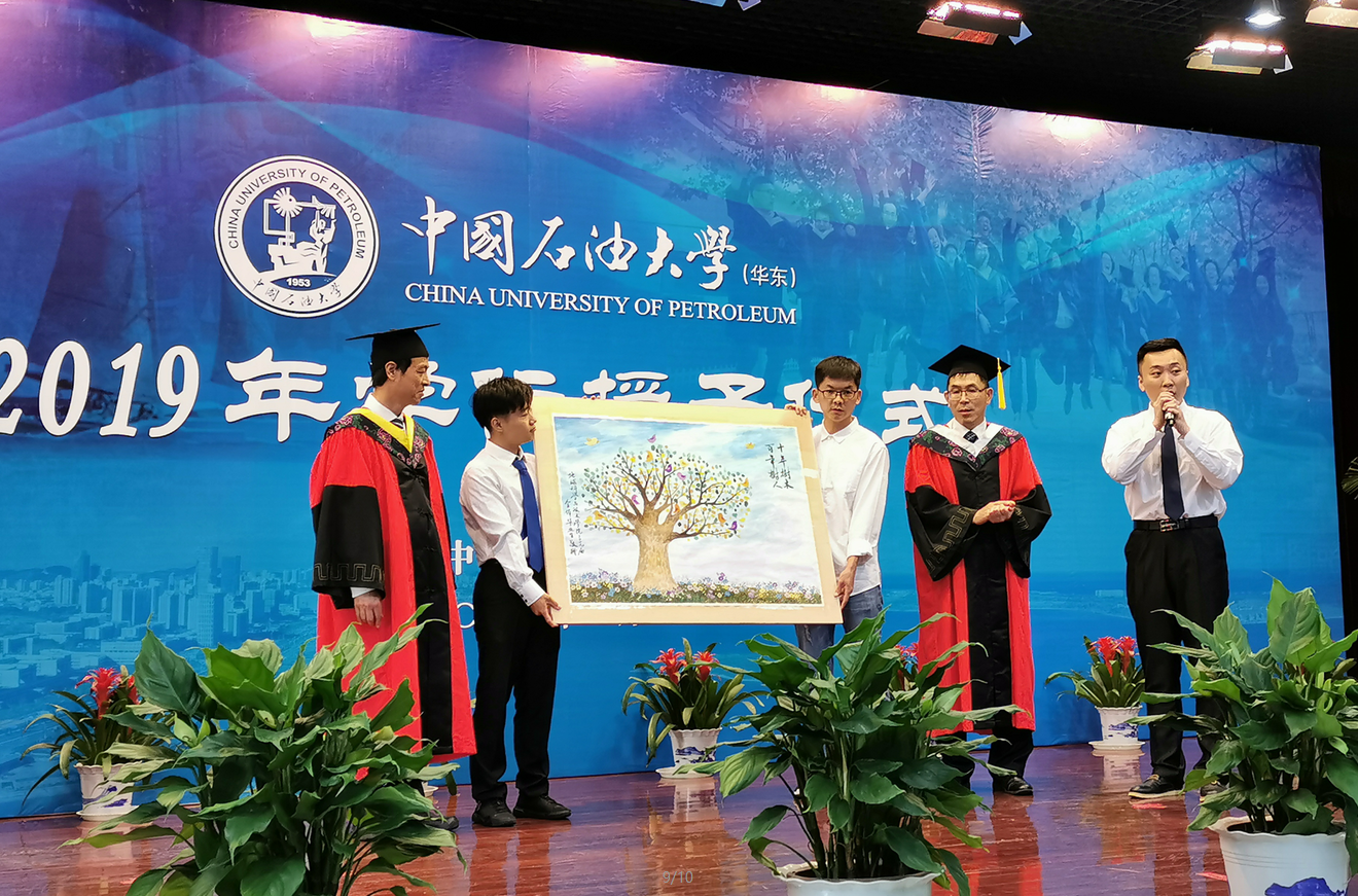 2015级本科生许旺、张岩代表全体毕业生为学院赠送礼物。“这幅名为’十年树木 百年树人’的画作由冰球突破豪华版官方网站2019届毕业生共同完成,画中的树干代表学校以及学院为我们提供的支持和平台;全体毕业生一起按下的指印作为树叶,寓意着我们在学院的支持下茁壮成长;树下铺满了勿忘我花草,象征我们永远会记得在母院学习和生活的日子,会记得老师们的谆谆教诲,会记得同学们之间的深厚情谊。也借这份礼物祝福母院十年树木,桃李满天下,百年树人,栋梁荣中华!”毕业生代表张岩说道。