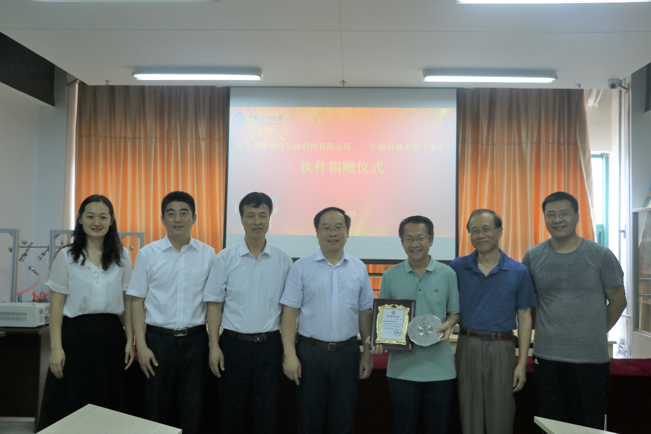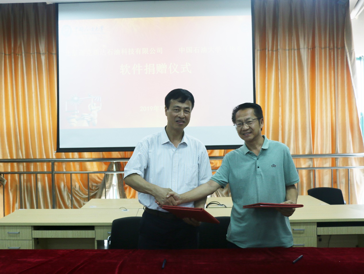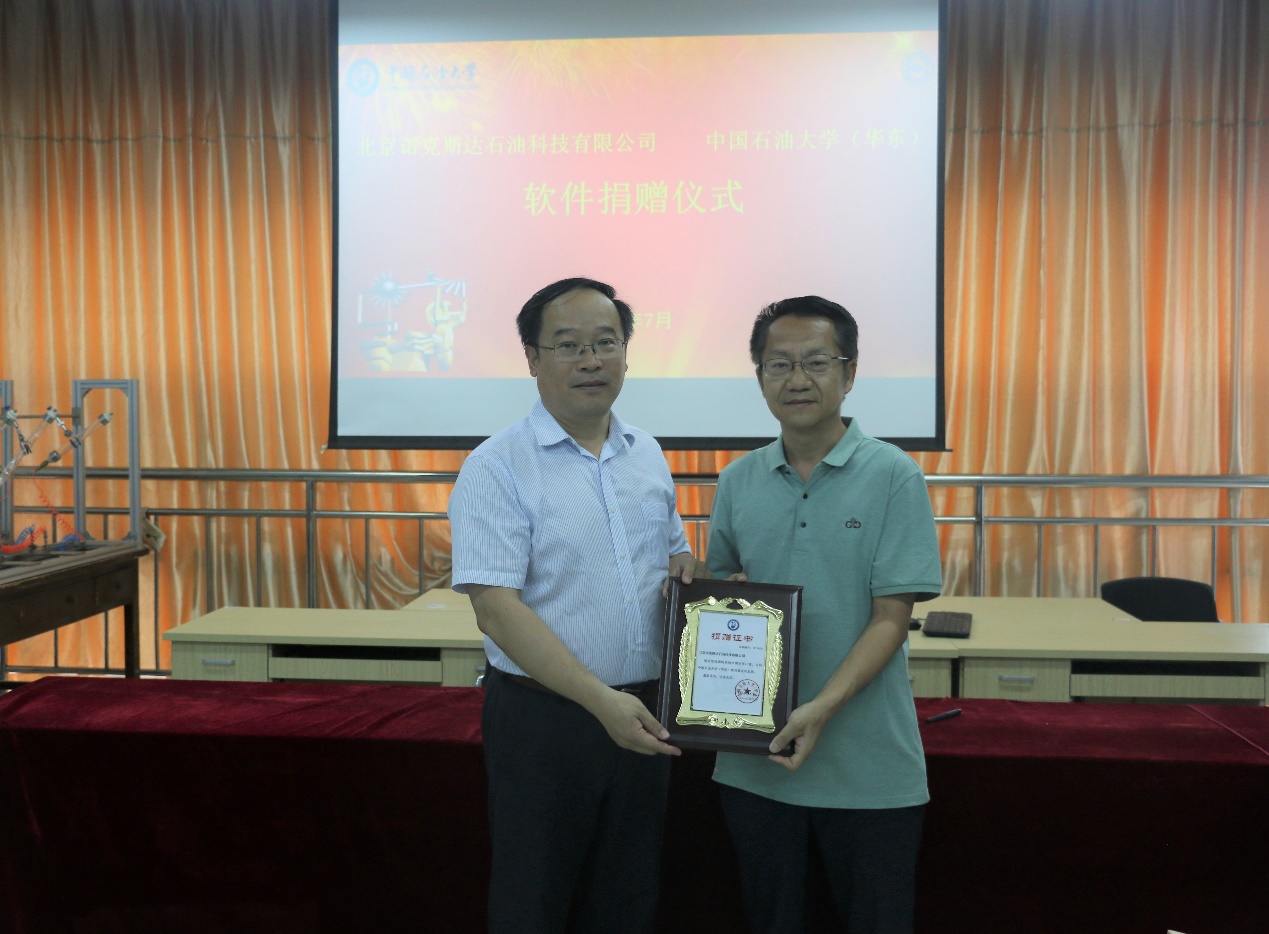 姚军代表学校向刘力辉颁发捐赠纪念牌,地球科学与技术学院院长林承焰与刘力辉共同签署了Geoscope软件捐赠协议。