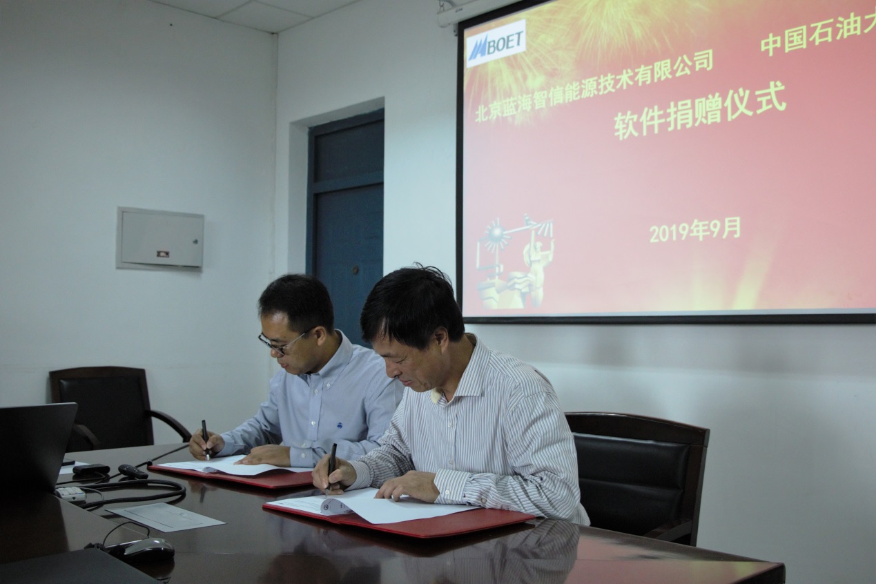 冰球突破豪华版官方网站院长林承焰、副总裁刘冠德签订软件捐赠协议,林承焰院长代表冰球突破豪华版官方网站接受捐赠。副校长姚军为刘冠德颁发捐赠证书。