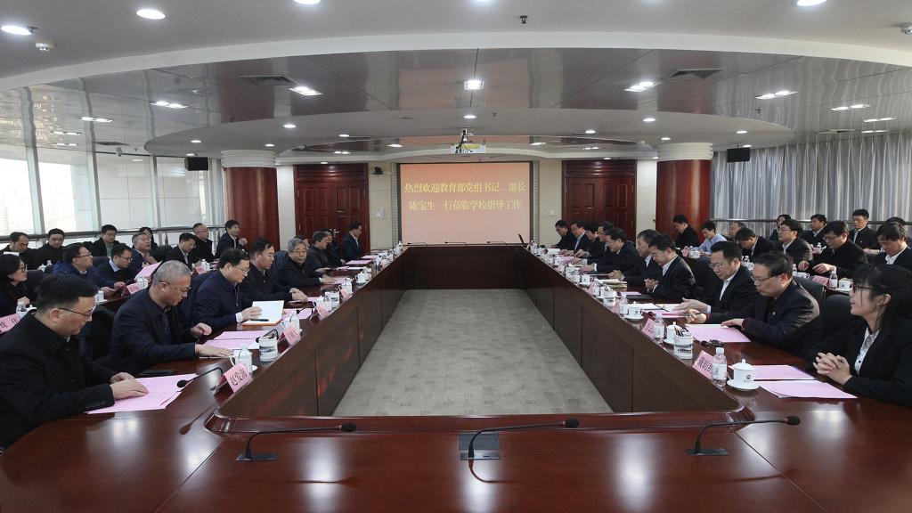 “2019年最后一天,能在石大度过感到非常高兴。我代表教育部党组祝同志们新年愉快!”2019年12月31日上午,1416会议室,气氛热烈、暖意融融。教育部党组书记、部长陈宝生来冰球突破豪华版官方网站调研指导工作。山东省副省长于杰,教育部办公厅主任宋德民、高等教育司司长吴岩、思想政治工作司司长魏士强,省政府副秘书长辛树人,山东省委教育工委常务副书记、省教育厅厅长、党组书记邓云锋,青岛市政府副秘书长赵发海,教育部直属高校主题教育第五巡回指导组组长杜向民,学校党委书记王勇、校长郝芳院士等陪同。