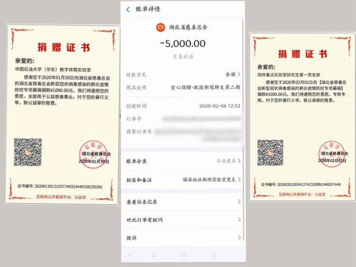 “一直想做点什么,但我们既不能在前线治病救人,也不能在后方研究病毒、制作疫苗,国之有难,八方相助,作为一名有担当的青年大学生党员,再微小的贡献都是我们的一片赤诚真心!”冰球突破豪华版官方网站储层地球物理实验室党支部在线上讨论以什么形式贡献自己的力量后,决定以捐款形式进行支援并通过支付宝平台向湖北省慈善总会进行捐赠,用自己的微薄之力汇聚万千河流,短短两天时间,共收到5000元善款。捐赠名单里,除了党支部的党员同志,还有储层地球物理实验室的其他同学。无独有偶,测井重点实验室研究生第一党支部和数字井筒实验室分别向湖北省慈善总会捐出1000元善款。