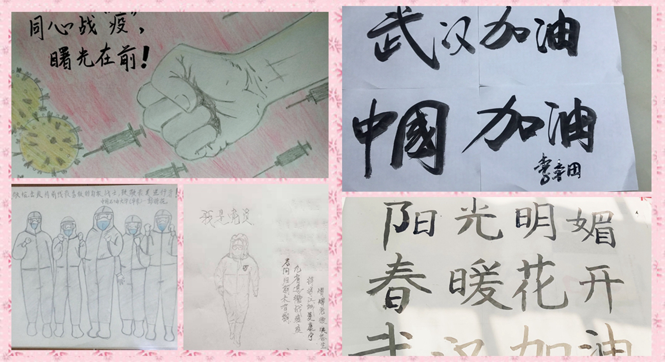 不在一线抗疫,后方支援努力。除募捐外,各学生党支部也通过书法、文字、绘画、音乐、剪纸等形式展现青年一代对民族、国家、社会、人民强烈的责任感和积极向上的良好精神面貌,表达对祖国的美好祝福,坚定战“疫”必胜的信心。