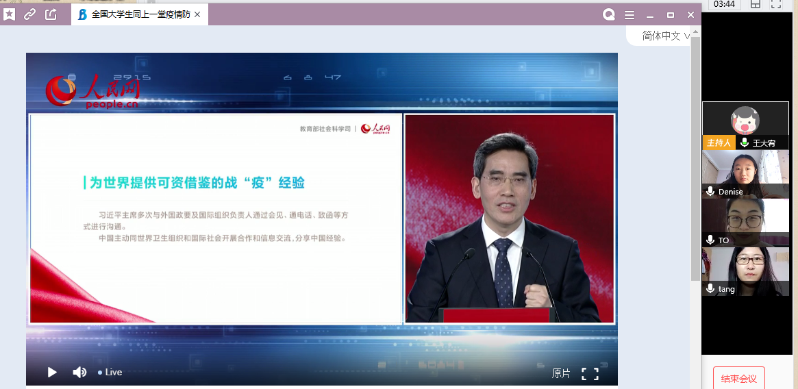 3月9日下午,由教育部社会科学司与人民网联合组织的“全国大学生同上一堂疫情防控思政大课”在人民日报社人民网“云开讲”。地球科学与技术学院积极响应,提前一天通过QQ群、微信群、微信公众号等多种渠道进行宣传,确保通知到位。在学院各党支部、团支部广泛组织学生观看直播,开展线上讨论,强化对思政课的理解和认识,提高学生党员担当责任意识,发挥党支部的战斗堡垒作用。