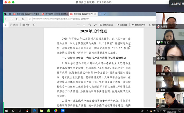 会议伊始,郑珊珊同志带领机关党支部全体同志解读学习了学校2020年工作要点,从坚持党建统领、加强统筹与规划、落实立德树人根本任务、推进人才强校战略、聚焦一流学科建设、坚持开放合作、改善办学条件七个方面,同时结合冰球官网的实际情况,具体解读了工作要点,为冰球官网接下来的工作开展提供了指导性意见。
