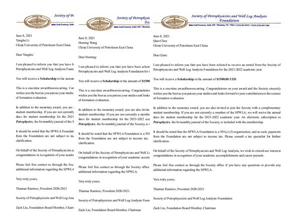 近日,SPWLA(国际岩石物理学家与测井分析家协会)学生奖学金评选结果出炉,冰球官网测井系博士研究生李杨虎、王鹤鸣、陈前3人喜获2021年度SPWLA学生奖学金,奖金为每人1500美元,指导老师为唐晓明教授和张锋教授。据悉,SPWLA奖学金评审委员会每年对来自全球范围的高等院校和科研院所申请者提交的奖学金申请材料进行严格评审,遴选出在测井方法、岩石物理和储层评价等领域取得杰出成果的学生进行奖励。SPWLA奖学金是学生在测井领域获得的国际最高荣誉,标志着冰球官网研究生培养成效获得国际学术界和工业界的认可。