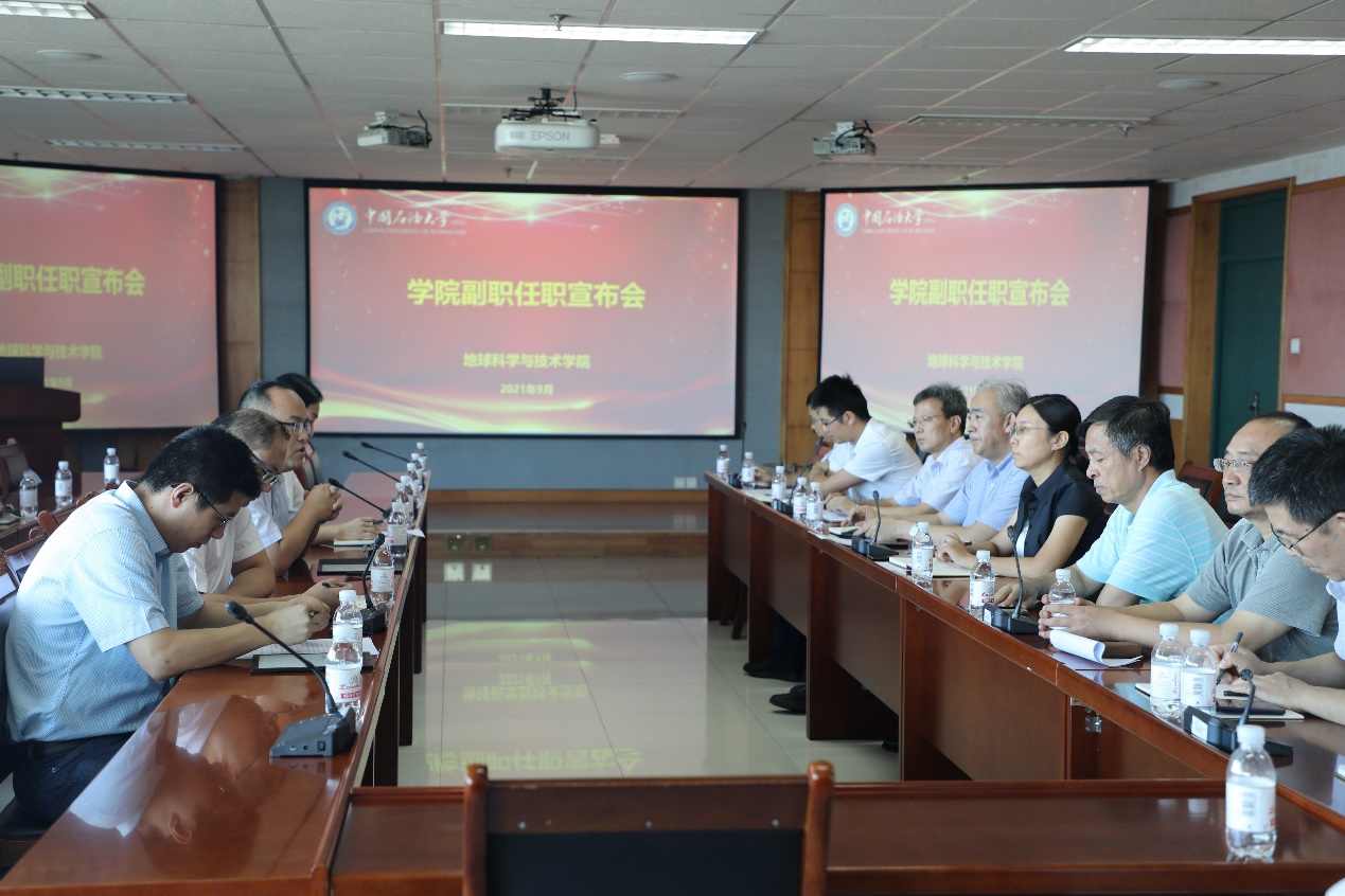 学院党委书记赵放辉同志首先宣布学校党委的任免决定:宗兆云、苏远大、张宪国、王健同志任地球科学与技术学院副院长,郑珊珊同志任地球科学与技术学院党委副书记,徐永涛同志任党委宣传部副部长兼新闻中心主任;免去:吴智平、邓少贵、张广智同志地球科学与技术学院副院长职务,徐永涛同志地球科学与技术学院党委副书记职务。