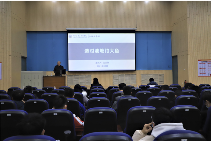 为帮助2019级学生明晰未来规划,引导学生树立大理想、接触大学问、形成大格局、实现大发展,12月8日,地球科学与技术学院《大学生学涯指导课》第八讲于南教楼100报告厅进行,学院党委书记赵放辉以“选对池塘钓大鱼”为题开讲,学院党委副书记郑珊珊、团委书记王力禾、部分辅导员及2019级全体学生参与,学生会主席团成员孙清主持课程。