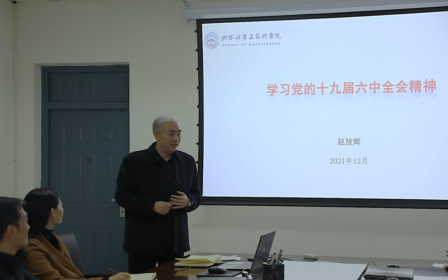 12月17日下午,学院机关党支部在工科C251会议室开展“学习党的十九届六中全会精神”主题党日活动,邀请学院党委书记赵放辉为支部党员讲授专题党课,会议由机关党支部书记郭雪娇主持,正处级专职组织员郝传宝、党委副书记郑珊珊及全体机关党支部成员、辅导员参加活动。