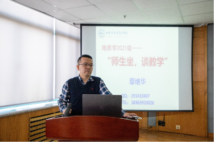随后,地质系副主任鄢继华以“师生坐,谈教学”为主题介绍地质学培养方案并在以往培养经验和存在的问题等方面进行交流。“希望你们可以做到把握专业定位、培养专业兴趣、探索学习方法、注意实践培训的专业学习方法。”鄢继华说道。