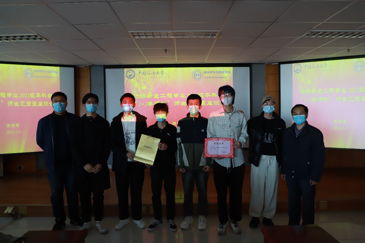 资源系党支部书记、主任张立强介绍了出席本次座谈会的各位老师并对全体师生的到来表示感谢。冰球突破豪华版官方网站副院长张宪国介绍了资源勘查工程专业的发展优势和导师制的重要性,并表示教师担负培养人才的重任,应在教书育人的工作中尽职尽责,从骨子里去爱护每一位学生。资源专业的学生应该认真学习专业知识,掌握最新的勘探技术,为油气勘探事业贡献青春力量。随后,由张宪国老师、徐守余老师,为资源2021级中表现突出的四个优良学风宿舍颁发荣誉证书。