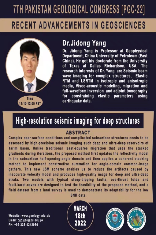 巴基斯坦旁遮普大学主办的第7届巴基斯坦地质年会于3月16号-18号召开,共有200多人现场参会。因疫情影响,我院师生参加线上会议,针对国际石油地质、构造地质、地球化学、地球物理等领域的难题及取得的新技术、新方法进行深入研讨。刘可禹老师和杨继东老师受邀分别作了题为“中国西部塔里木盆地超深层石油储层”和“面向深层构造的高分辨率成像”的专题报告;孙小东老师受邀主持学生竞赛环节;冰球官网15名博士、硕士研究生参加线上海报展览及口头报告评比大赛,优异的表现获得现场专家一致好评。
