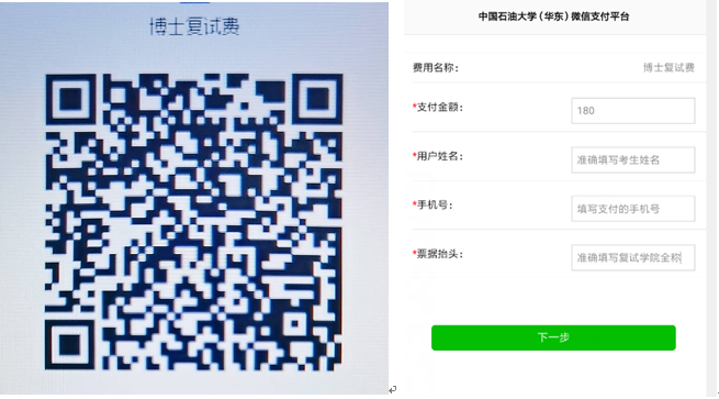 博士复试费180元/人,请参加复试的同学5月14日资格审查之前完成扫码缴费,资格审查时出示缴费截图,确认已缴费。用户姓名须填写考生姓名,票据抬头须准确填写为地球科学与技术学院。