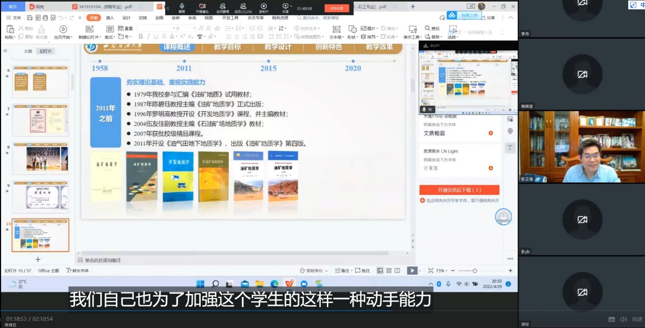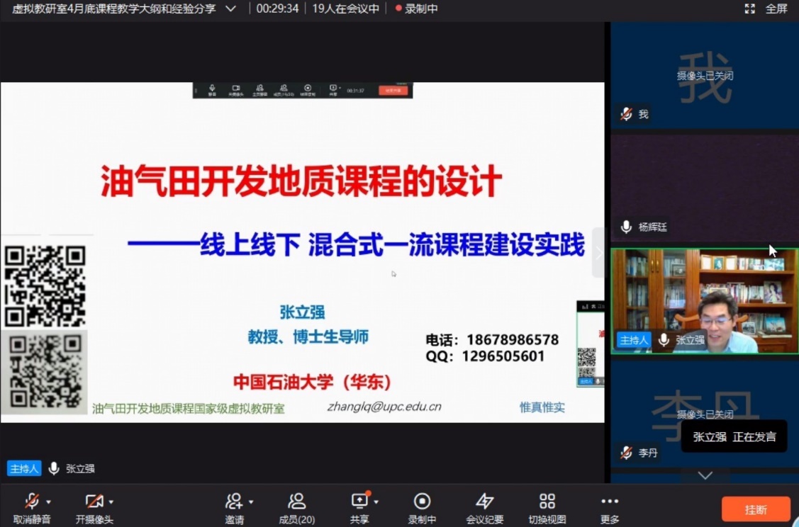 为响应教育部落实立德树人根本任务,加快教育高质量发展的号召,落实教育部加快推进虚拟教研室试点建设的工作要求,油田开发地质课程教育部首批虚拟教研室建设点从今年3月开始开展了系列研讨活动,规划了教研室2022年工作重点、规范了教学活动时间和相关制度。按照计划,4月29日,该教研室开展了教学大纲、教学经验分享研讨活动。来自冰球突破豪华版官方网站、山东科技大学、西北大学、西南石油大学、东北石油大学、西安石油大学、中国地质大学(武汉)、中国石油大学(北京)等12所高校的教研室骨干30余人参加了本次研讨活动。