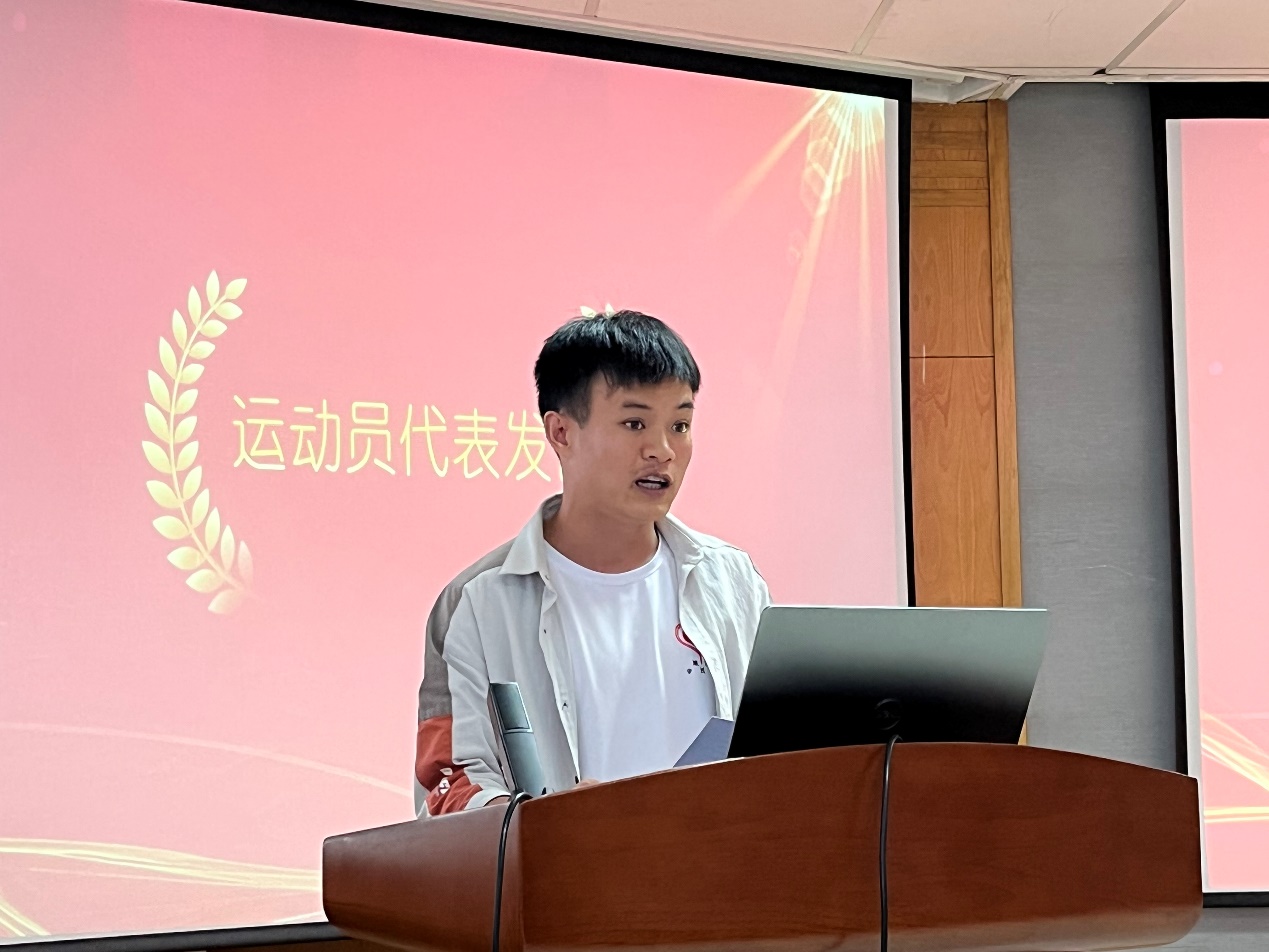 接着,与会领导老师分别为优秀运动队、突出贡献个人、优秀教练员、体育之星、优秀运动员代表、体育运动积极分子代表、优秀志愿者代表颁奖。学生运动员许伟章代表受表彰个人讲话,他通过“感谢与感动”“情怀与执念”“展望与启航”三个方面,回顾了自己通过参与体育运动磨炼蜕变的精彩故事,讲述了全体运动员刻苦训练、永争第一的拼搏事迹,代表全体运动员表达了对学院大力支持的感谢。