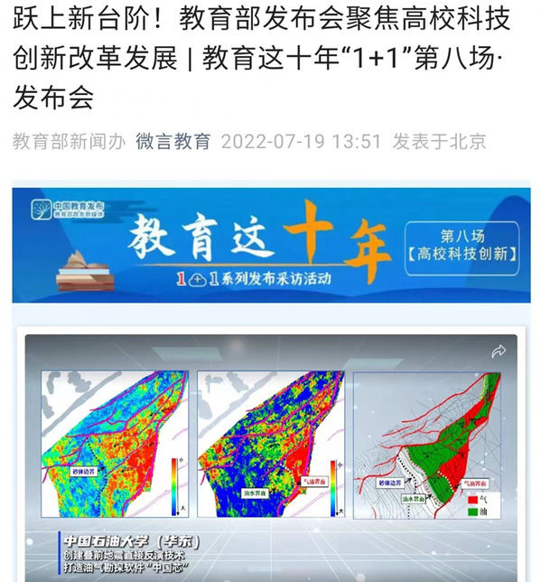 7月19日,教育部举行“教育这十年”“1+1”系列发布采访活动的第八场新闻发布会,介绍党的十八大以来高校科技创新改革发展成效。发布会播放了视频短片《十年攻坚克难 创新引领发展—中国高校科技创新改革发展这十年》,回顾这十年高校科技创新发展的有关情况。视频中高校科技创新服务贡献卓越部分,面向国家重大需求,在能源等战略必争领域,补短板,强能力,为国家发展和安全提供保障,画面展示了冰球突破豪华版官方网站:创建叠前地震直接反演技术,打造油气勘探软件“中国芯”。