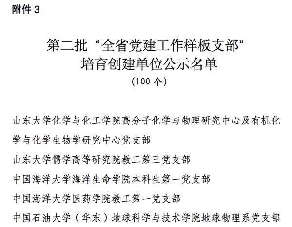 根据《中共山东省委教育工委关于开展第二批全省新时代高校党建示范创建和质量创优申报及第三批全国新时代高校党建示范创建和质量创优遴选工作的通知》(鲁教工委函〔2021〕65号)安排,经组织推荐、专家评审、集体研究,遴选产生了10个全省党建工作示范高校、50个全省党建工作标杆院系、100个全省党建工作样板支部培育创建单位。