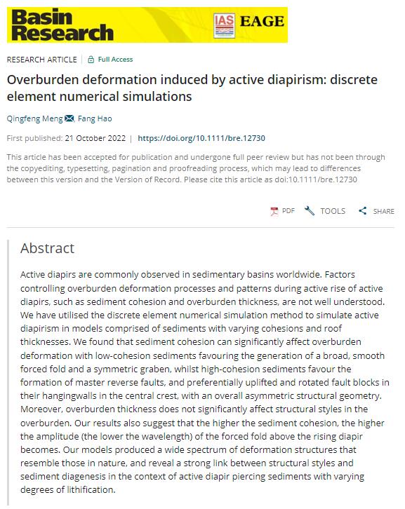 【本站讯】近日,学院郝芳院士团队在地质过程数值模拟研究方面取得重要进展,相关成果《主动底辟作用引发的上覆岩层变形:离散元数值模拟》(Overburden deformation induced by active diapirism: discrete element numerical simulations)发表于地球科学领域国际著名学术期刊《Basin Research》。论文作者为孟庆峰教授和郝芳院士,第一署名单位为冰球突破豪华版官方网站。该研究得到青岛海洋科学与技术国家实验室“十四五”重大项目基金、国家自然科学基金创新群体和山东省泰山学者研究基金联合资助。