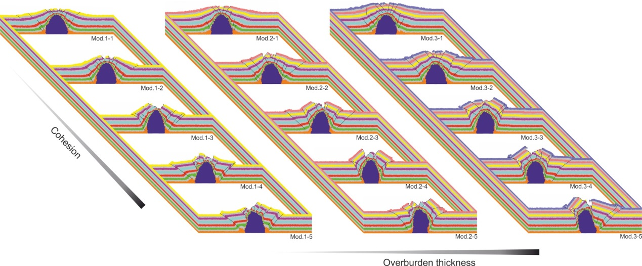 本研究运用离散元数值模拟方法搭建了一系列主动底辟构造的上侵模型,采用不同初始条件参数组合,成功模拟了以地堑系统为主导和逆冲断层系统为主导的底辟上拱导致的构造圈闭的形成过程(图1),并有效地模拟了各类底辟相关断层的位移和开度,创新性地建立了底辟上覆岩层成岩程度与其构造变形样式的直接关系。研究成果可为复杂底辟构造的地震数据地质解释、输导体系和油气成藏机理研究提供重要参考依据。
