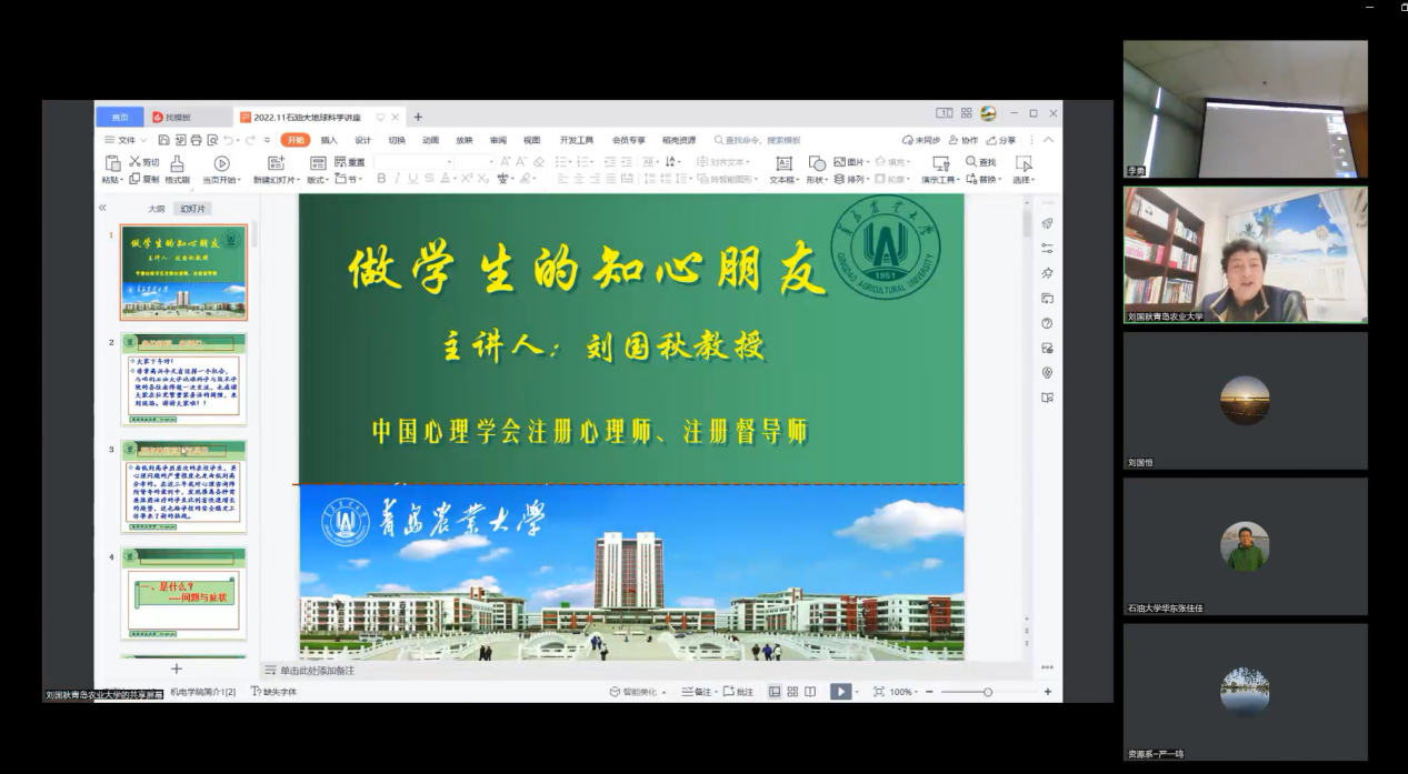 11月27日下午,2022石大师说系列导师沙龙第44期在冰球官网成功举办,本期沙龙特邀请原中国心理卫生协会大学生心理咨询专业委员会委员,原青岛农业大学党委副书记刘国秋教授做了“做学生的知心朋友”专题心理报告。由于疫情原因,会议采用线上形式进行,由宗兆云副院长主持,学院2022年新晋研究生导师和其他导师共同参会。