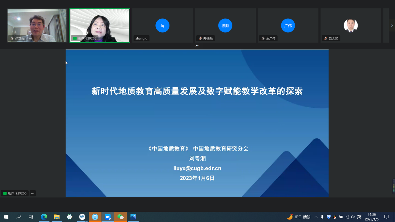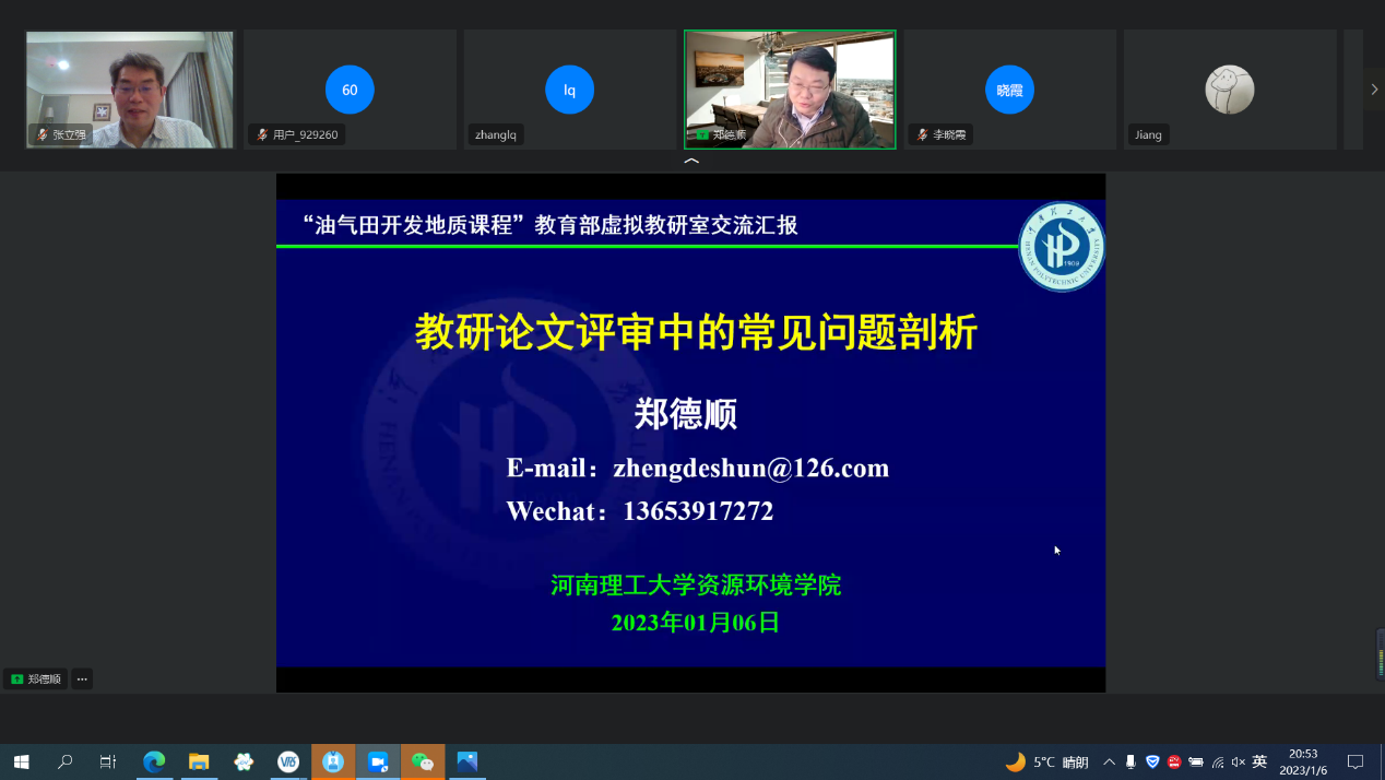 1月6日,教育部油气田开发地质课程虚拟教研室举办“教学研究和高质量教学论文”专题教研活动。冰球突破豪华版官方网站张立强教授主持研讨会,邀请了《中国地质教育》常务副主编刘粤湘编审、河南理工大学资源环境学院副院长郑德顺教授作主题报告,来自冰球突破豪华版官方网站、中国地质大学(武汉)、西北大学、山东科技大学、中国石油大学(北京)、西南石油大学、西安石油大学、中国矿业大学等20余所高校的50余位教师参加了本次研讨活动。