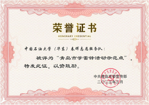 春晖志愿服务队成立于1992年3月5日,隶属于全国党建工作标杆院系、山东省先进基层党组织地球科学与技术学院党委,是我校最早的志愿服务组织之一。30年来,春晖志愿服务队始终坚守在为老、为小、为困难群体的服务一线,塑造出“移动地质博物馆”“星路启航·大龄自闭症帮扶行动”“青春伴夕阳”等一系列“学雷锋”服务品牌,累计开展志愿服务活动2700余次,服务时长超19万小时,5万余人次参与其中,用实际行动践行和弘扬雷锋精神。荣获山东省学习雷锋志愿服务先进集体、山东省首批青年志愿服务示范项目、山东省“三下乡”社会实践活动优秀服务队等省级荣誉10余次,入选团中央“强国有我‘核’你一起”大学生志愿宣讲团和全国大学生科技志愿服务示范团队,2021年被团中央授予中国青年志愿者优秀组织奖。三十年奉献、坚守、传承,6000余名志愿者赓续雷锋精神,前赴后继投身志愿服务事业,已成为石大青年践行雷锋精神、锤炼自我、施展抱负的真实写照,相关事迹被新华网、光明网、人民网、中国网等媒体报道百余次,涌现出中国青年五四奖章、全国践行社会主义核心价值观先进个人、中国大学生自强之星标兵等一批先进个人。