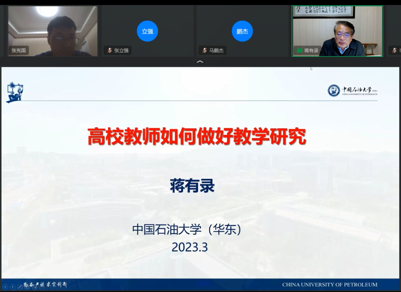 2023年3月30日,资源勘查工程专业教育部虚拟教研室举办了“教学研究专题论坛”,教研室主任、国家级教学名师蒋有录教授作了“高校教师如何做好教学研究”的专题报告。专题论坛由冰球突破豪华版官方网站地球科学与技术学院副院长张宪国教授主持,来自中国石油大学、中国地质大学、中国矿业大学、西北大学、长安大学、山东理工大学等十余所高校的60余名教师参加了专题论坛。