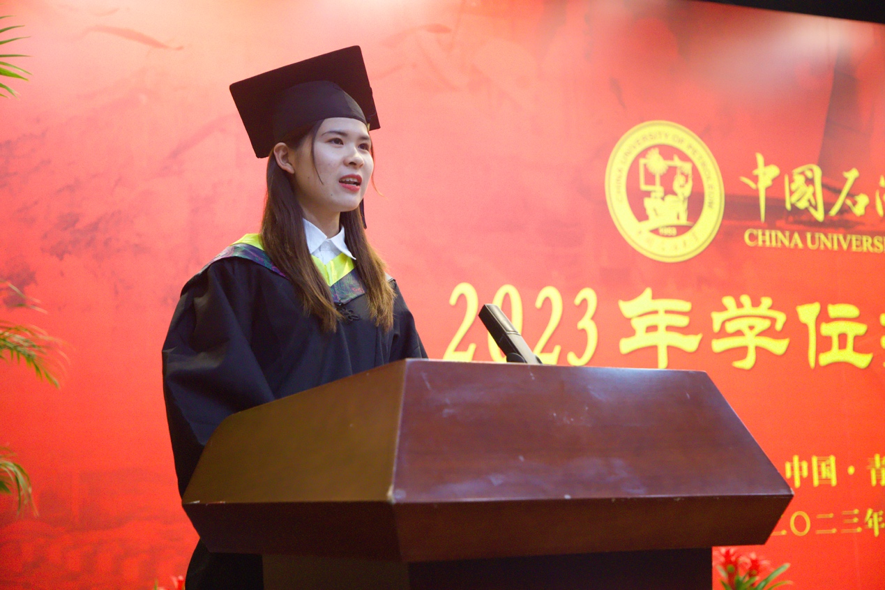 地质资源与地质工程专业张东林作为研究生毕业生代表发言,分享了在石大和冰球突破豪华版官方网站一路以来的成长与感悟。他表示,作为一名勘探学子,将时刻牢记习近平总书记“能源的饭碗必须端在自己手里”的嘱托。在未来的科研工作中,将继续保持奋发图强、担当有为的精气神,为祖国能源事业的发展不懈奋斗。