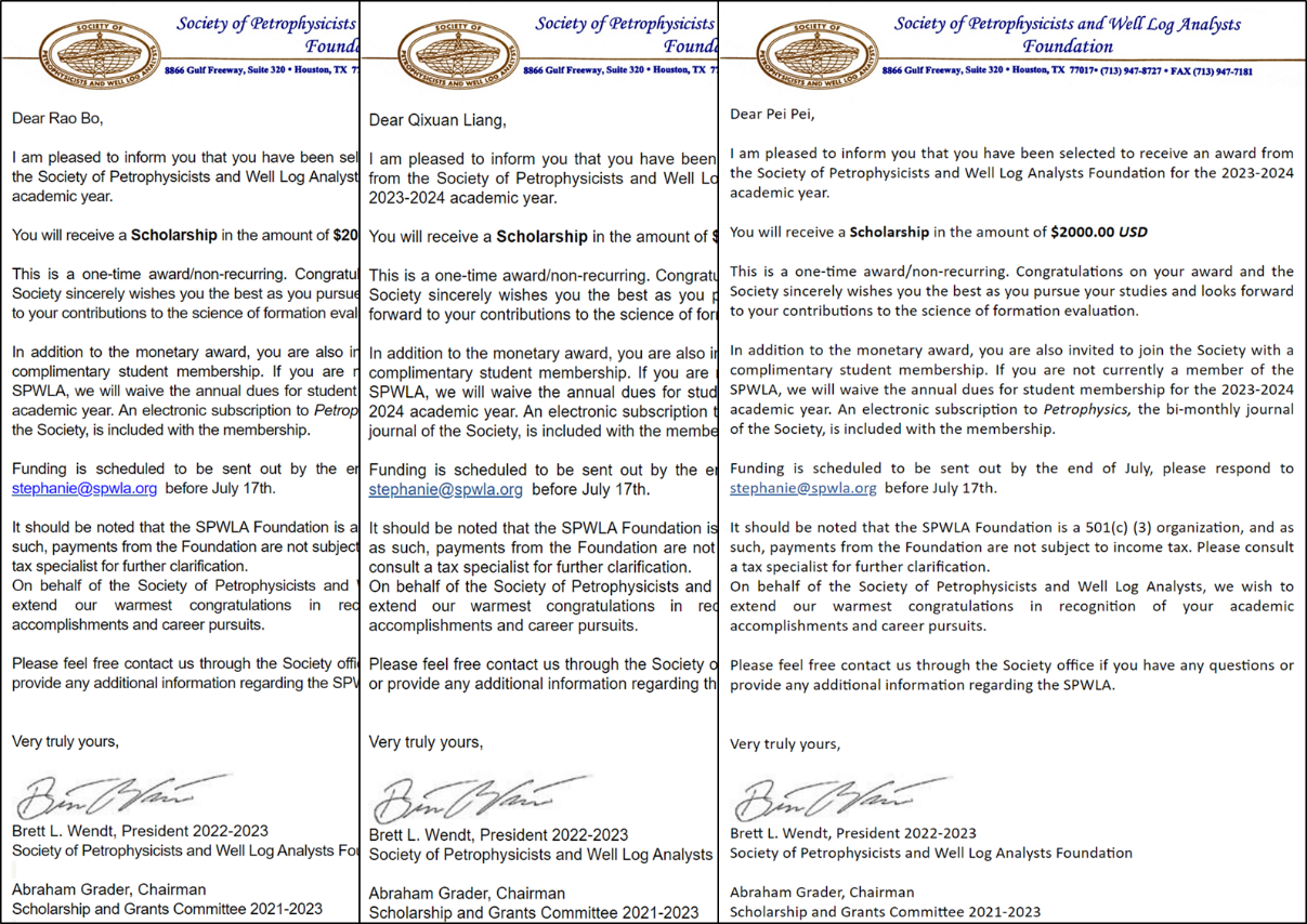 近日,经过国际岩石物理学家和测井分析家学会(Society of Petrophysicists and Well Log Analysts,SPWLA)评定,冰球官网测井系博士研究生饶博、梁启轩和硕士研究生裴培3人获得2023年度SPWLA学生奖学金,奖金为每人2000美元。指导教师分别为苏远大教授、张锋教授和邓少贵教授。