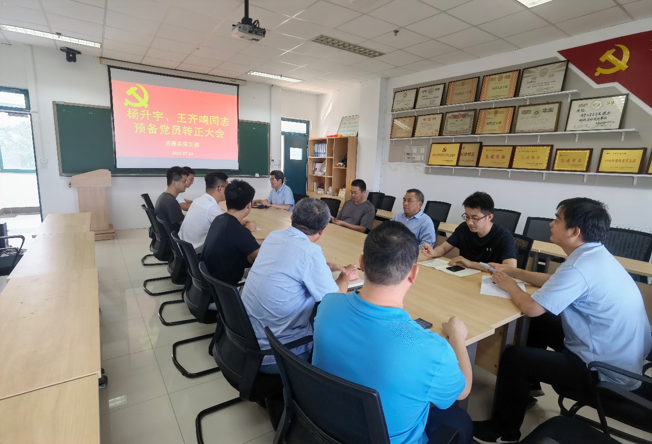 2023年7月24日,资源系党支部召开杨升宇、王齐鸣同志预备党员转正大会。资源系党支部在校的全体党员参会,部分党员线上参会。会议由资源系党支部副书记王广伟副教授主持。