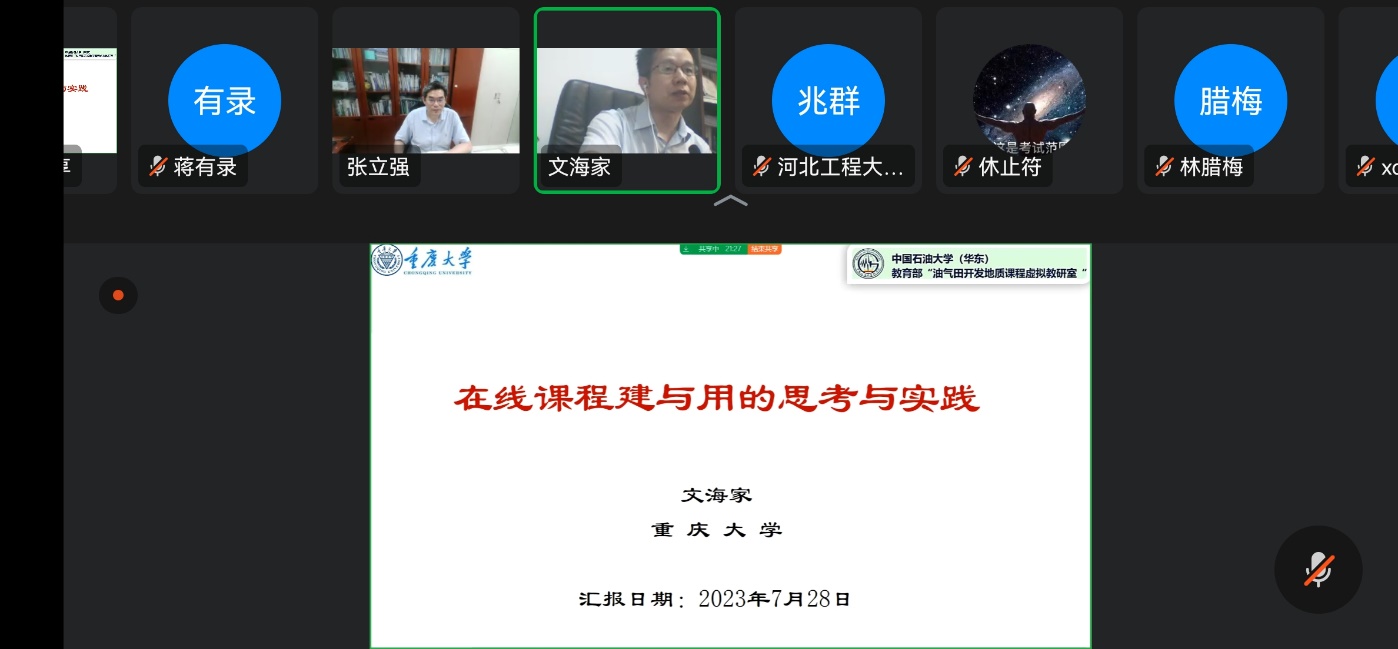 2023年7月28日晚,教育部"油气田开发地质课程虚拟教研室"、“资源勘查工程专业虚拟教研室”举办线上课程建设专题讲座,邀请了重庆大学博士生导师文海家教授作题为《在线课程建与用的思考与实践》的专题报告,资源勘查工程专业虚拟教研室主任、国家级教学名师蒋有录教授,以及来自山东科技大学、西北大学、中国地质大学(武汉)、中国矿业大学、河北地质大学、贵州大学和河北工程大学等20多所高校的两个虚拟教研室的骨干教师参加了本次会议,教育部虚拟教研室负责人、资源系主任张立强教授主持会议。