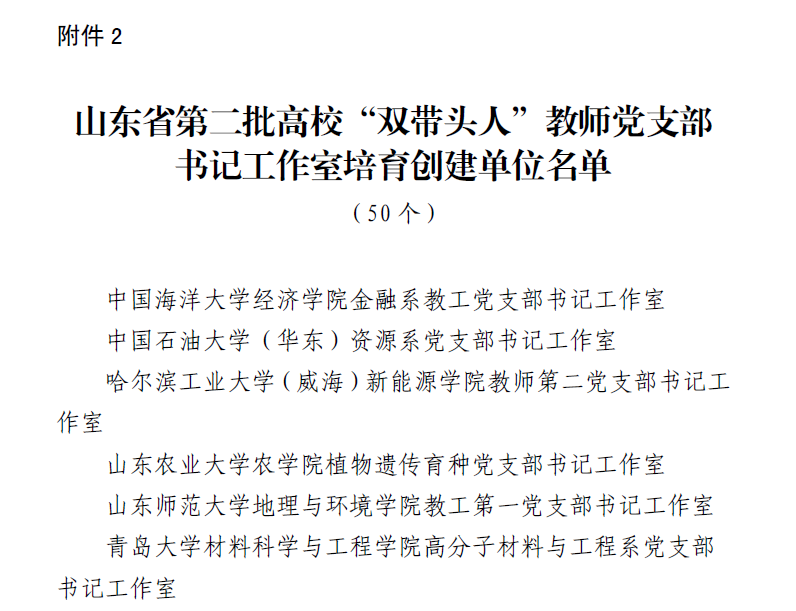 根据《中共山东省委教育工委关于开展第二批全省高校“双带头人”教师党支部书记工作室建设的通知》的安排,经学校申报、专家评审、集体研究、结果公示,遴选出50个“双带头人”教师党支部书记工作室。