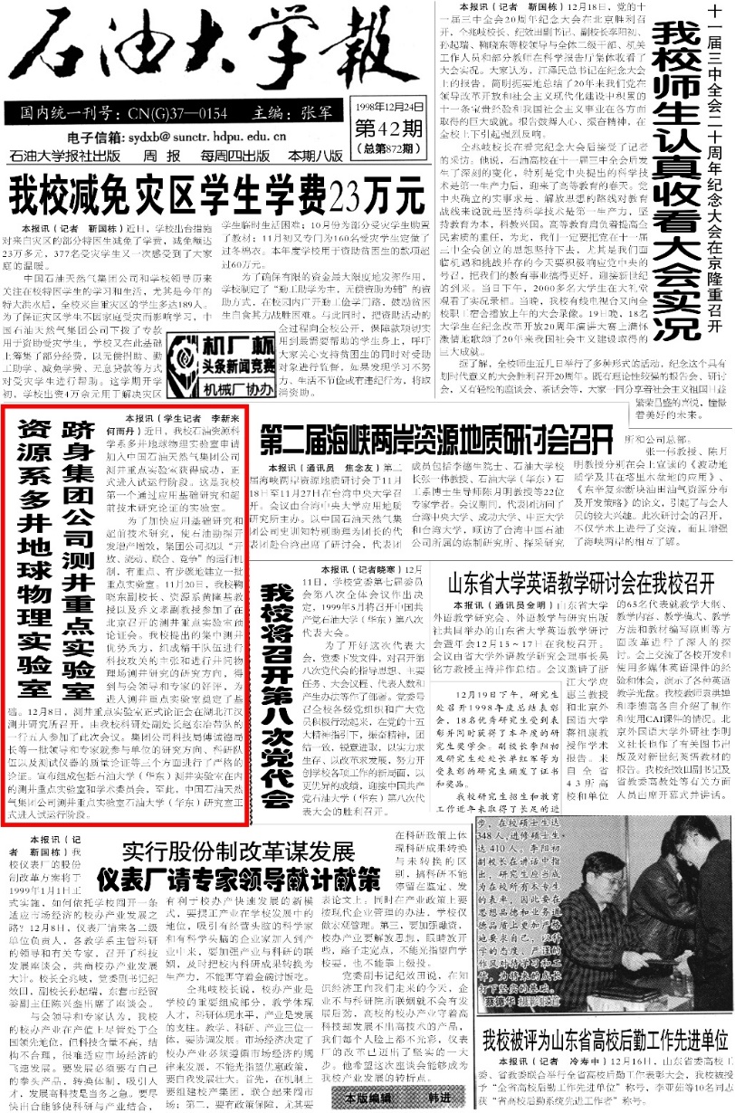 1998年12月,我校石油资源科学系多井地球物理实验室申请加入中国石油天然气集团公司测井重点实验室获得成功,正式进入试运行阶段。这是我校第一个通过应用基础研究和超前技术研究论证的实验室。