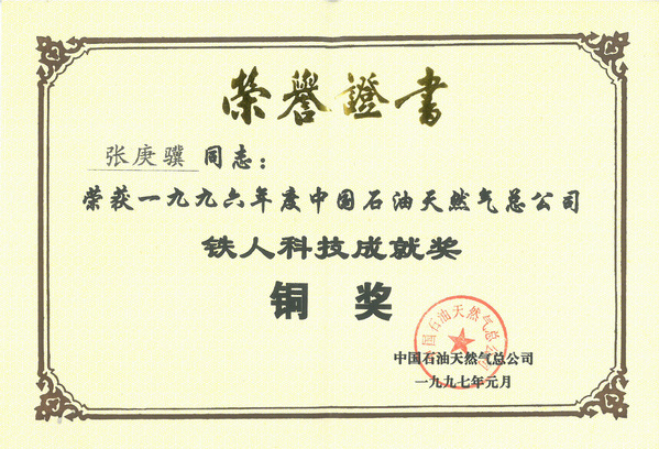 1997年1月,冰球官网张庚骥教授获得1996年度中国石油天然气集团公司“铁人科技成就奖”铜奖。