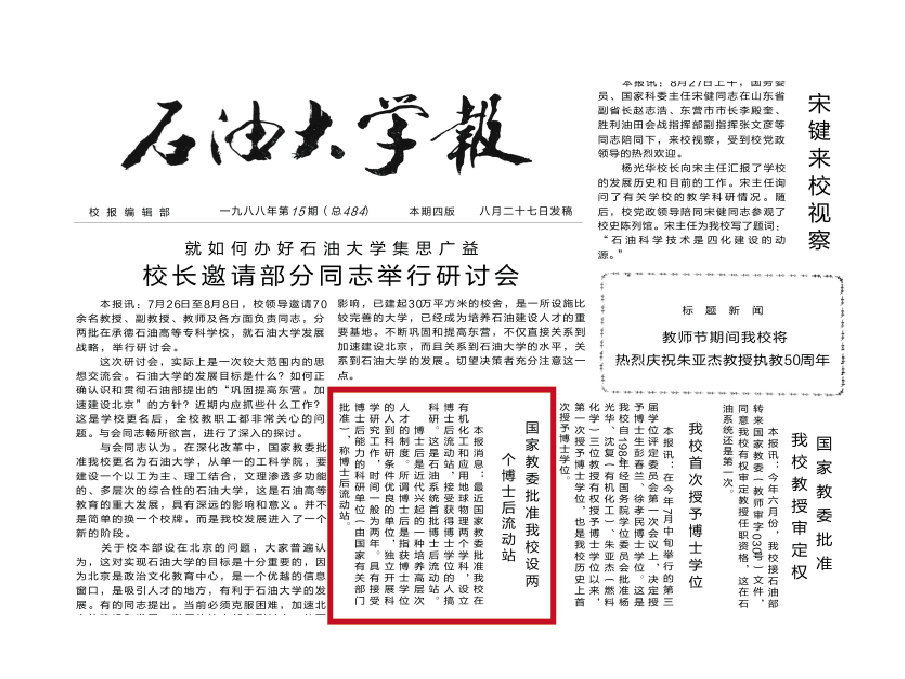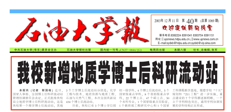 1988年,国家科委批准我校设立应用地球物理博士后科研流动站,这是我校也是石油系统首批博士后科研流动站之一。1998年,获批设立地质资源与地质工程博士后科研流动站,2003年,新增地质学博士后科研流动站。