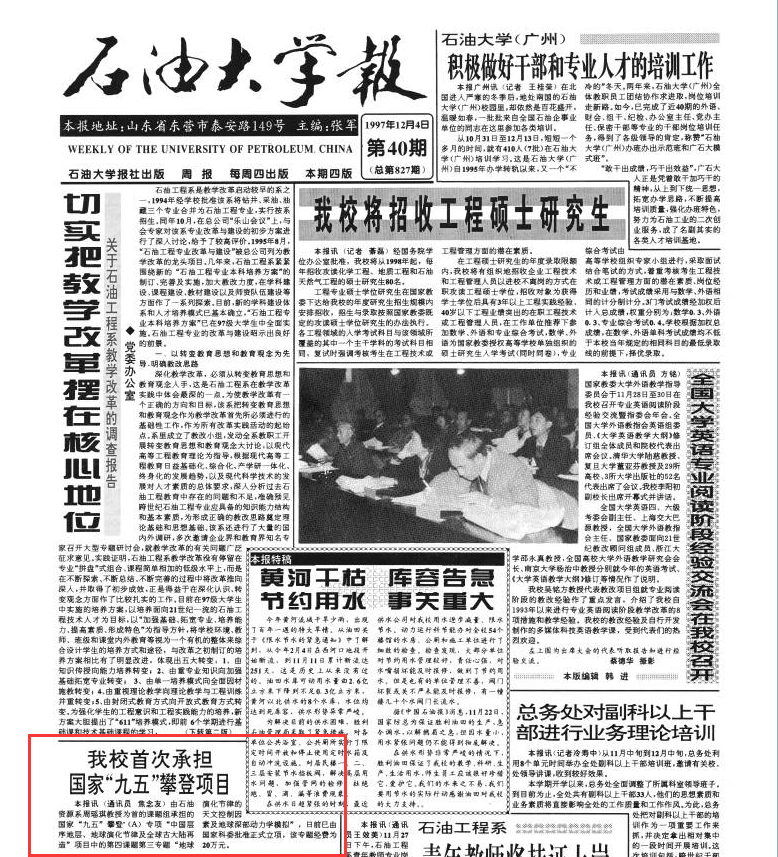 1975年5月,勘探系教师雍世和、黄一飞、洪有密与胜利油田测井公司、计算中心合作完成我国第一张测井数字处理成果图。