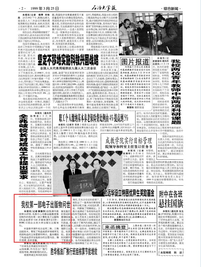 1999年3月25日,由陈清华教授牵头研制、电教中心冯春法副教授策划制作的我校第一部计算机电子出版物《构造地质学CAI多媒体课件》(CD-ROM)由北京大学出版社出版发行。