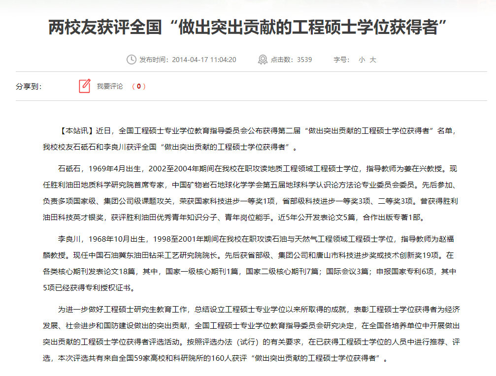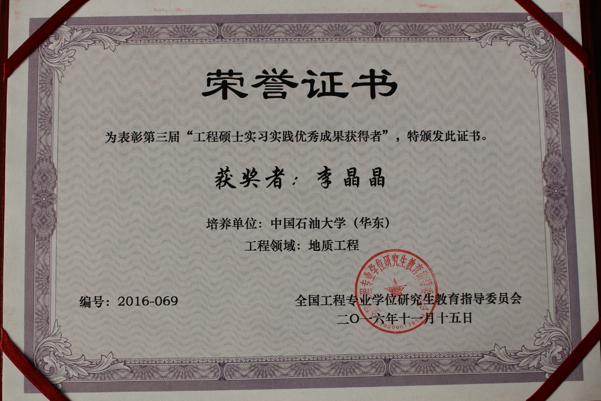 2016年11月,全国工程专业学位研究生教育指导委员会发布《关于公布第三届“工程硕士实习实践优秀成果获得者”荣誉称号名单的通知》,冰球官网2015届全日制工程硕士毕业生李晶晶获得该荣誉称号。
