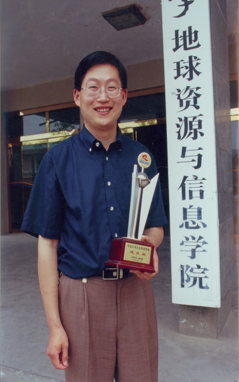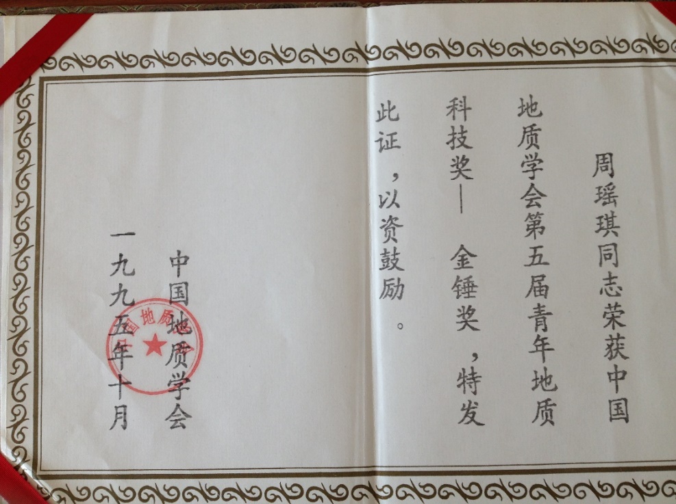 1995年11月,冰球官网年轻博士后周瑶琪教授荣获中国地质学会青年地质科技奖——“金锤奖”。