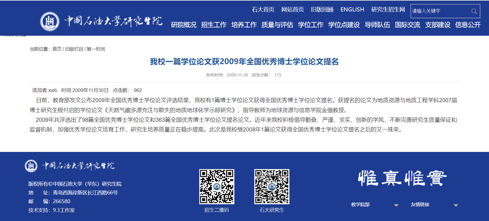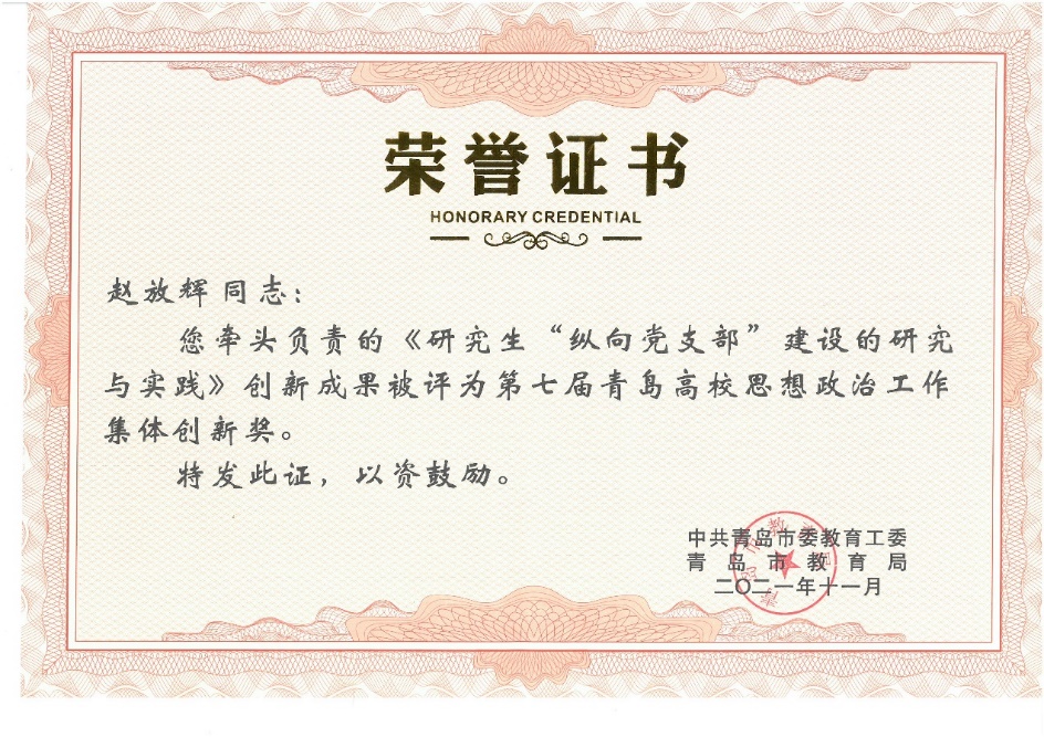 2021年11月,青岛市委教育工委公布第七届青岛高校思想政治工作创新奖获奖名单,冰球官网申报的项目《研究生“纵向党支部”建设的研究与实践》获青岛高校思想政治工作集体创新奖,是我校唯一获集体创新奖的项目。