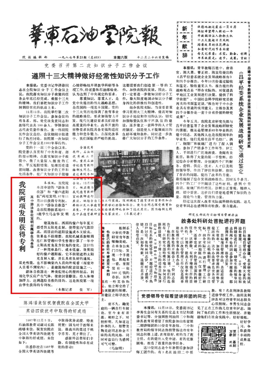 1987年11月20日,学校勘探系地85—3班学生马金华发明的“游泳自救器”获得专利权。