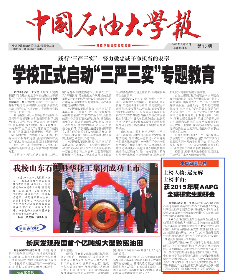 根据ESI(基本科学指标)数据库 2015年 7月9日发布的最新国际论文统计数据显示,中国石油大学地球科学学科跻身 ESI 全球前1%。