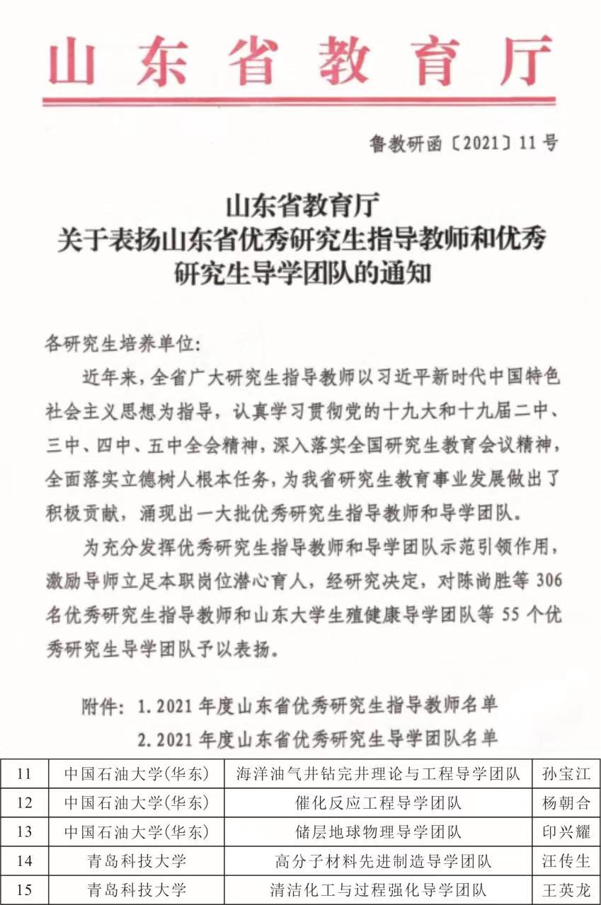 2021年9月,山东省教育厅发文公布山东省优秀研究生导学团队名单,冰球官网印兴耀教授负责的储层地球物理导学团队名列其中。