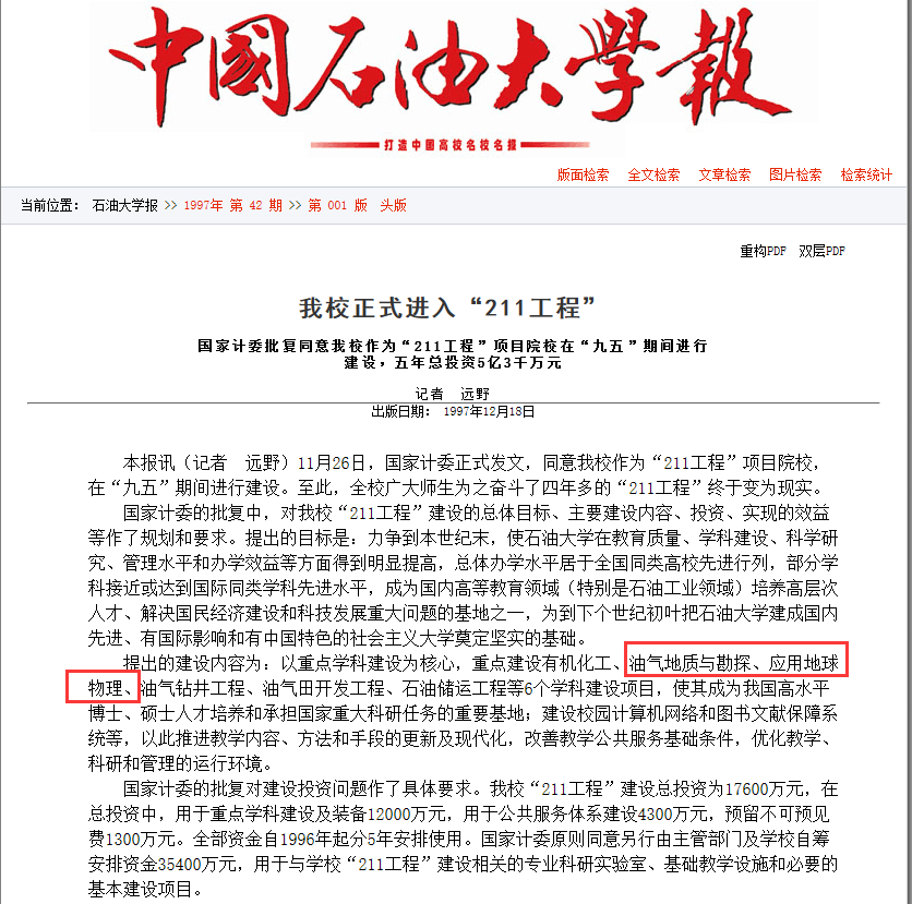 1997年11月26日,国家计委正式发文,同意石油大学作为“211工程”项目院校在“九五”期间进行建设。冰球官网油气地质与勘探、应用地球物理学科入选重点建设学科。