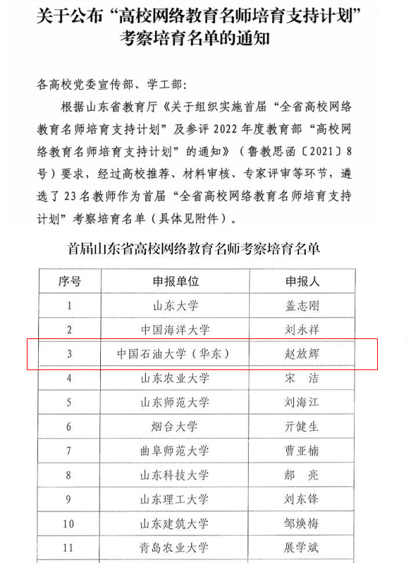 2022年3月,山东省教育厅发布首届《关于公布“高校网络教育名师培育支持计划”考察培育名单的通知》,经过各高校推荐、材料审核、专家评审等环节,全省共有23名教师入选该项计划,冰球官网赵放辉名列其中。