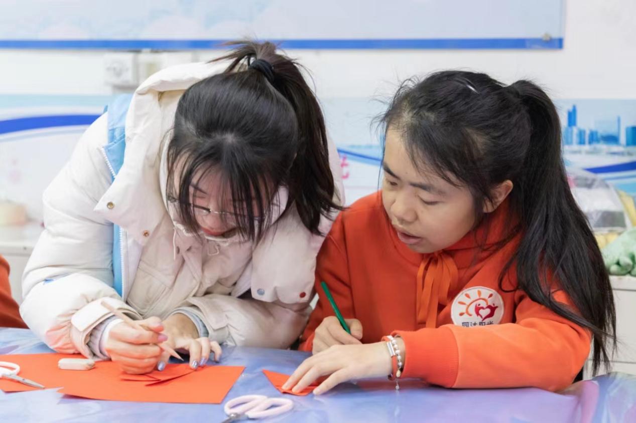 3月4日,春晖志愿服务队前往青岛市同沐阳光残疾人辅助性就业中心,开展主题“同享蓝天,共沐阳光”剪纸艺术实践活动,与在场的自闭症患者们共同参加剪纸活动,陪伴他们度过充实温暖的一天,在过程中鼓励他们拥有属于自己的自信与快乐。