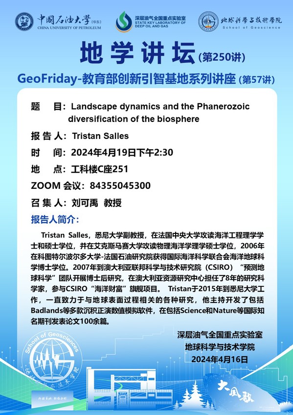 【地学讲坛第250讲】关于Tristan Salles 副教授《地貌景观动力学与显生宙生物圈的多样化》学术报告的通知