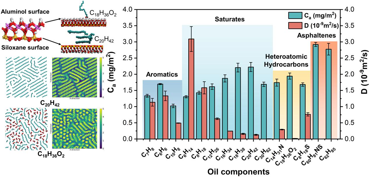 图1. 不同组分烃类化合物在黏土基面上的吸附、扩散特性和分子取向特征