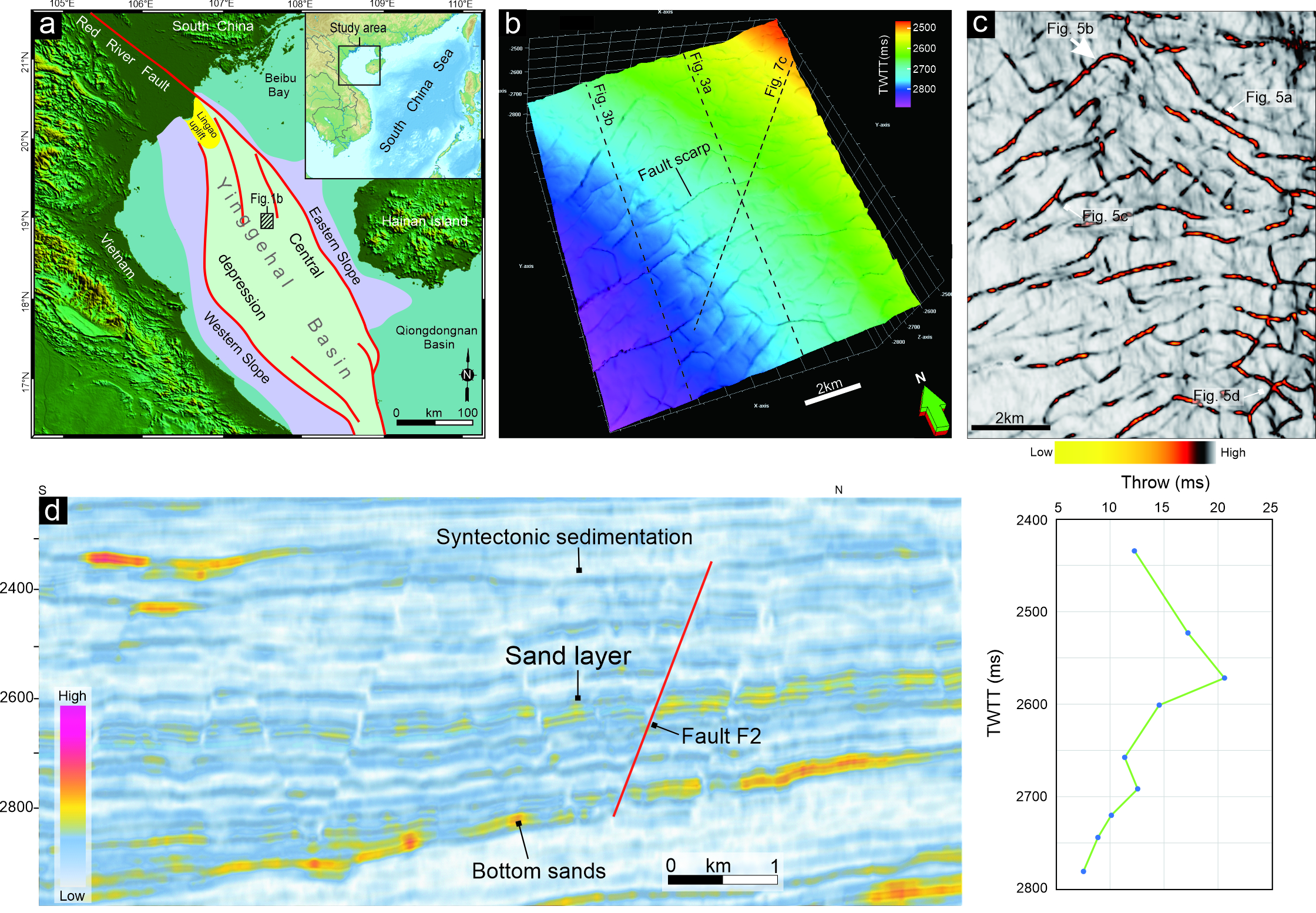 图1.莺歌海盆地梅山组多边形断层特征(a-c)及及剖面特征